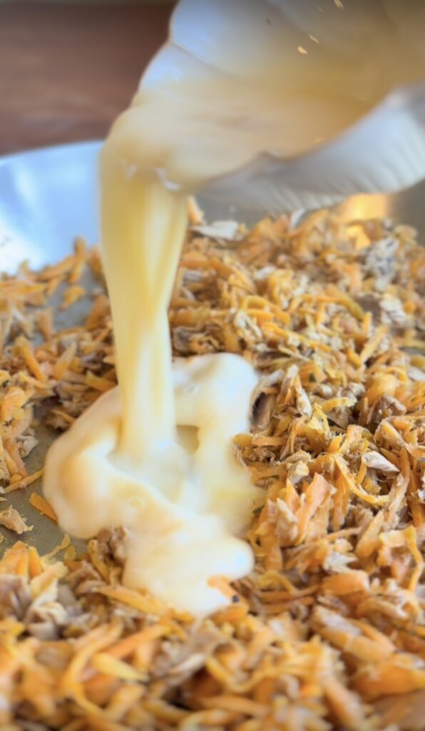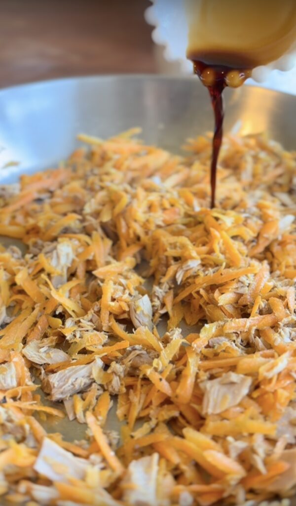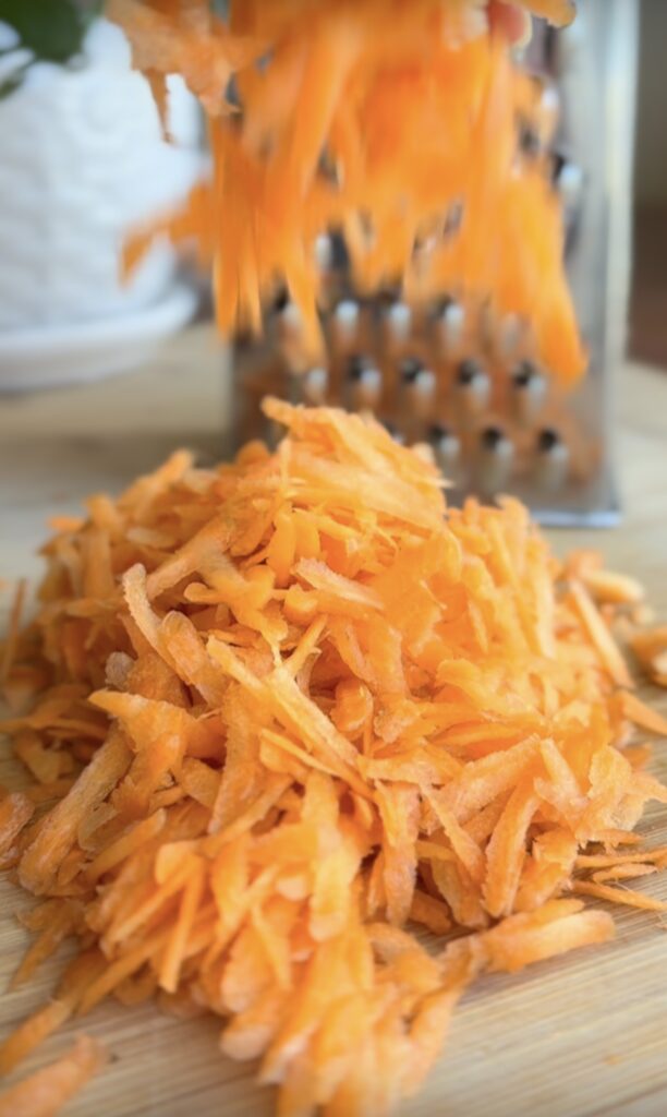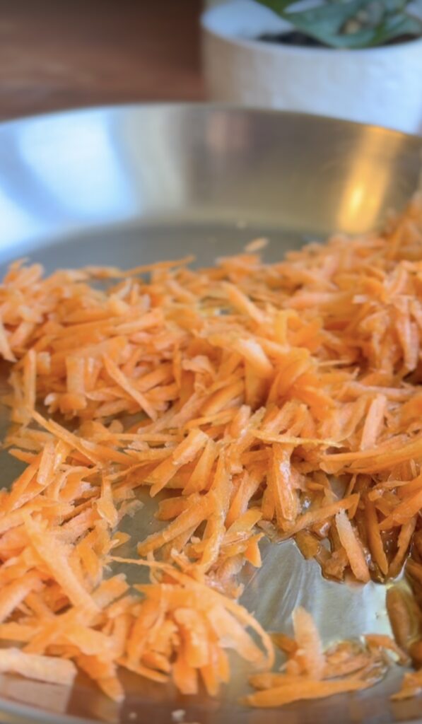 Peel the skin if needed and Shred the carrot using a slicer or mandoline into thin matchsticks. The thinner, the better—they’ll cook faster and have a fluffier texture.