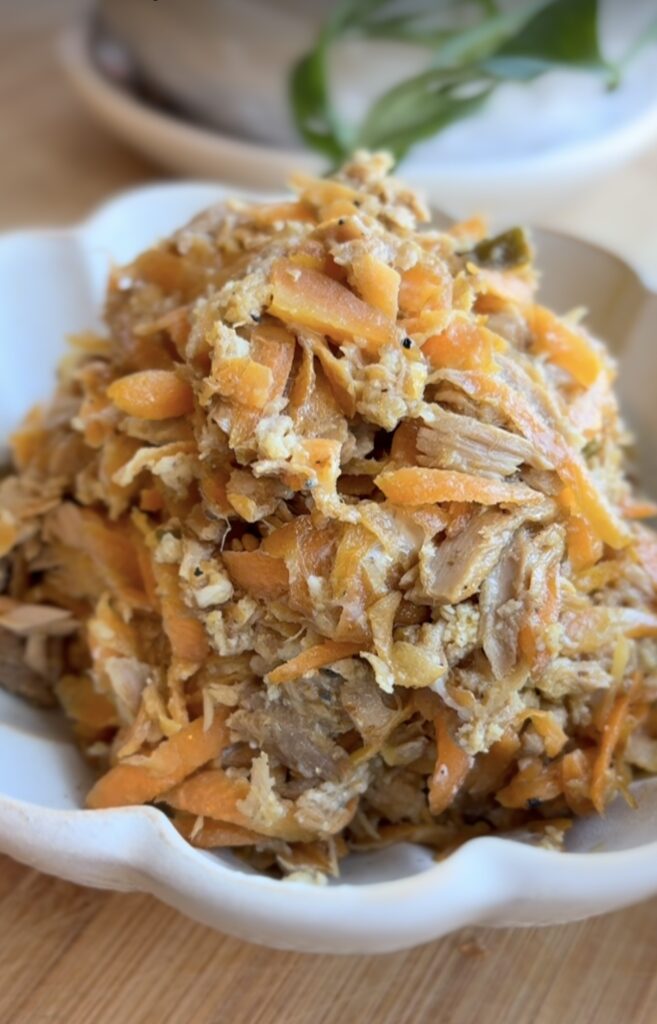 It comes from the onomatopoeic sound of shredding carrots with a special Okinawan slicer. Don’t worry if you don’t have one—a mandoline or box grater works just fine.