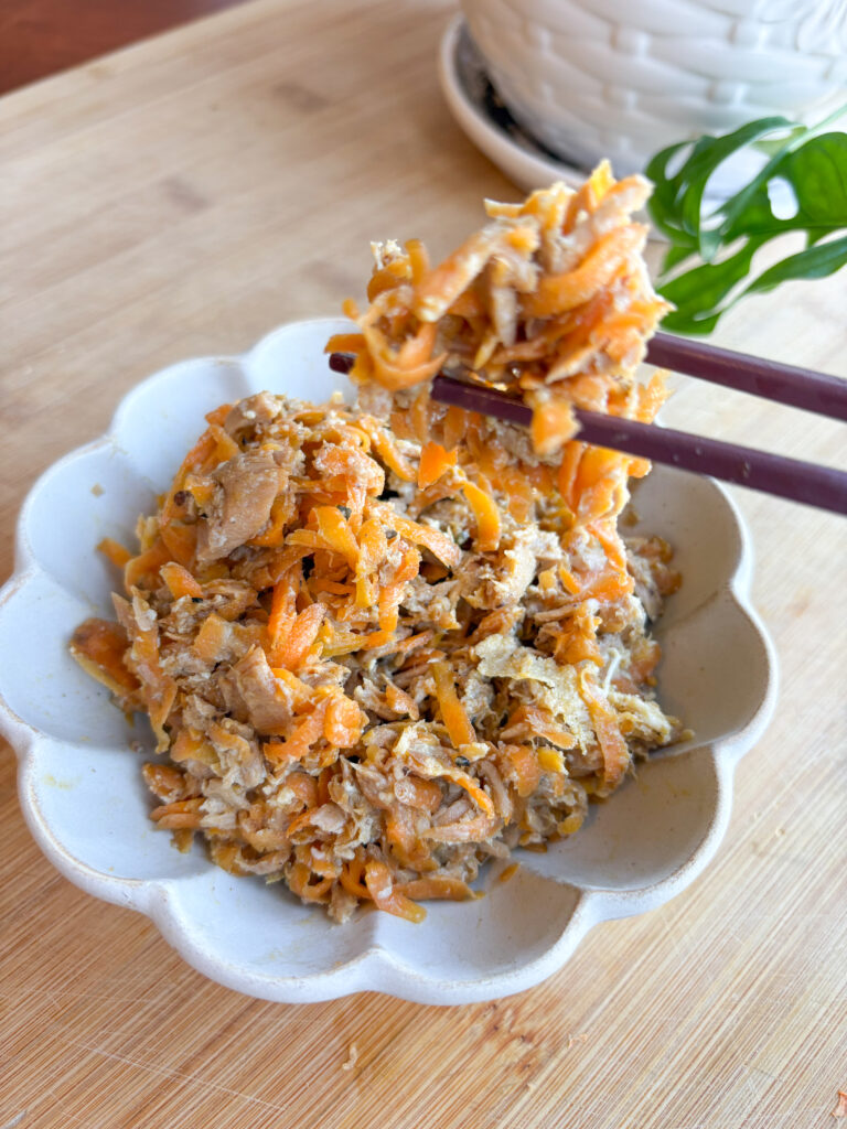 Ninjin Shirishiri is a simple stir-fry of shredded carrots, tuna, and egg. It’s quick, budge-friendly, and so delicious that you’ll want to scoop it right over a steaming bowl of rice.