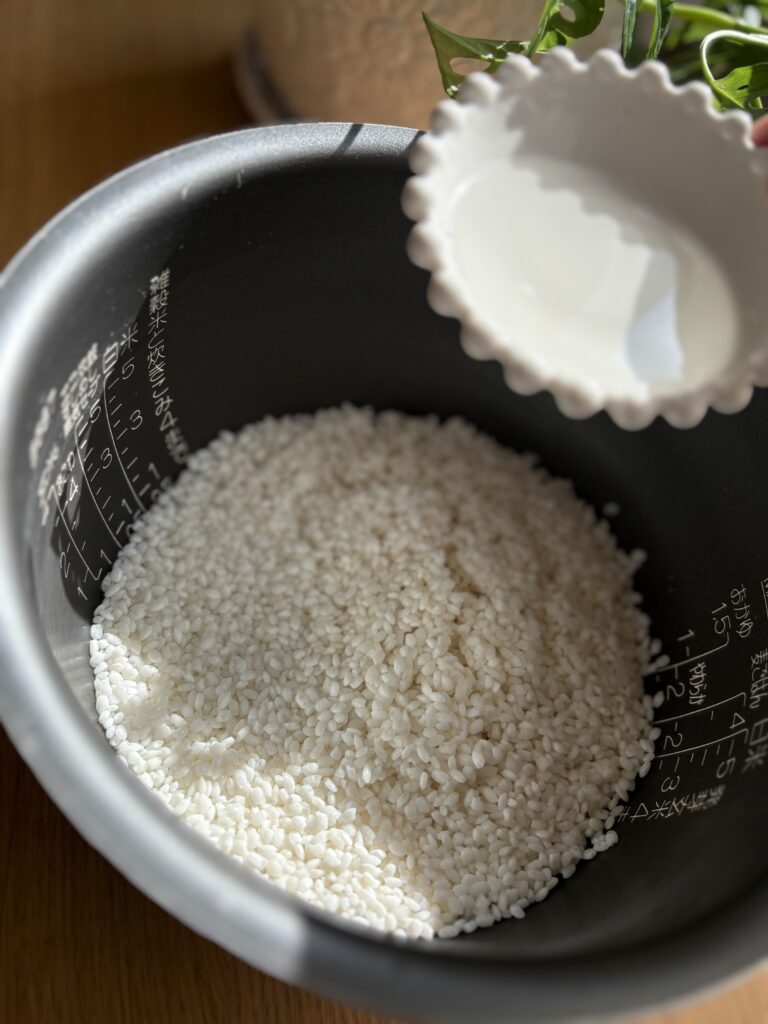 - Water – to the 2-cup line in the rice cooker
