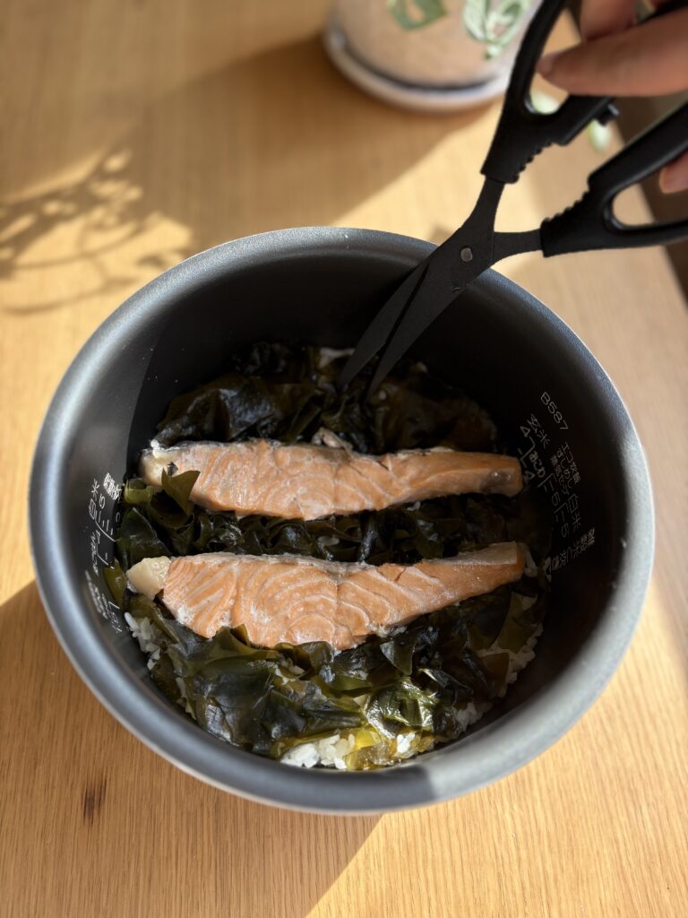 - Place salmon and dried wakame on top of the rice. Cook as usual in the rice cooker.